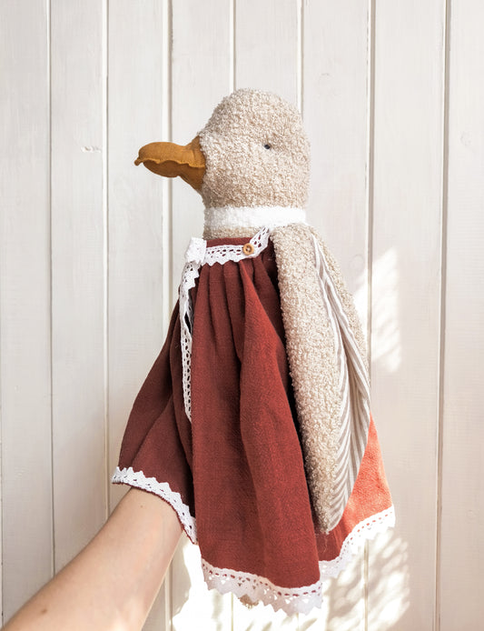 Sold outStuffed Girl Duck in Brick-Red Dress