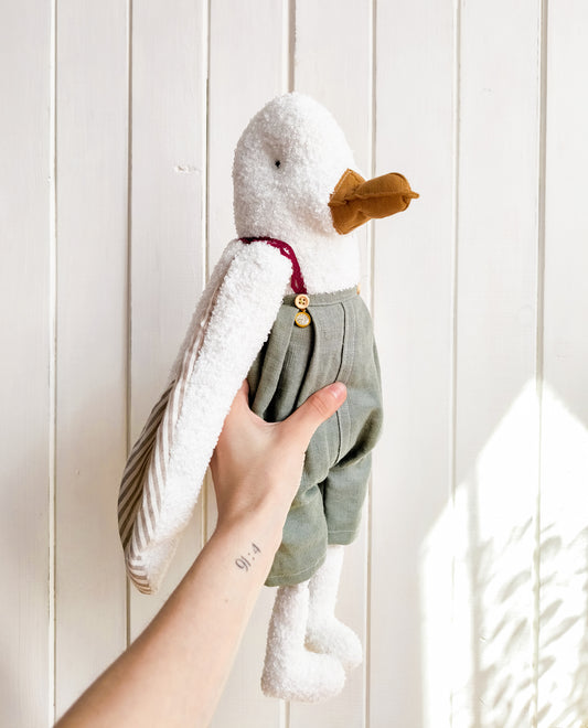 Sold outWhite Duck in Mint Linen Overalls