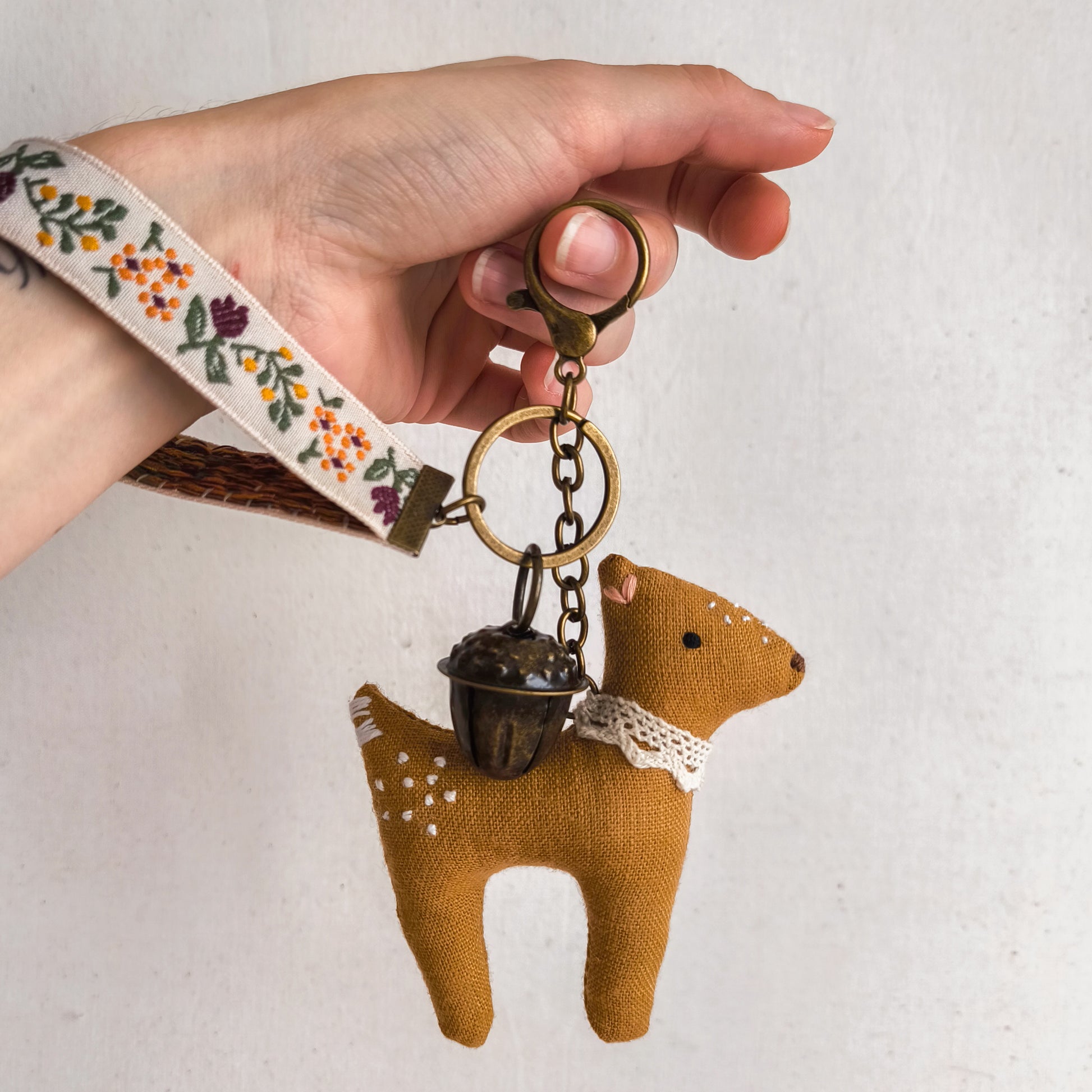 Unique keychain with deer made with natural linen and cotton. The deer is embroidered with small cute details, and the soft lace collar adds a rustic, vintage touch. Finished with a bronze key ring and embroidered wristlet strap, it’s both practical and charming.