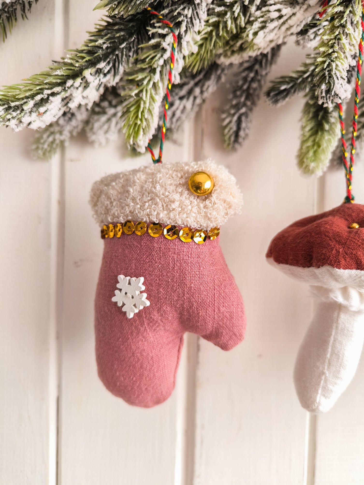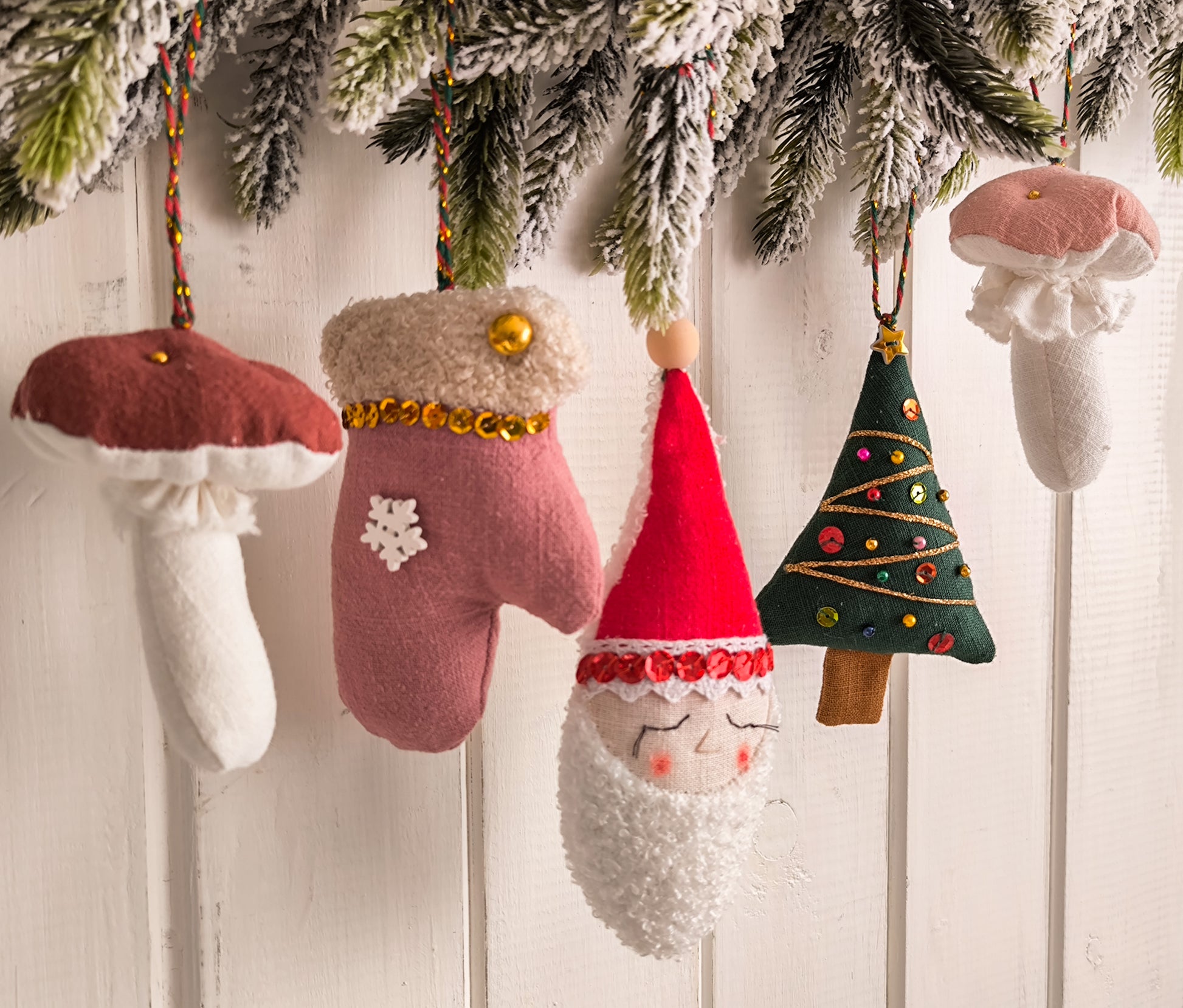 The set includes a Santa Claus, a winter glove, a Christmas tree, and two mushrooms: pink & red, all created with delicate details and warm festive colors. Perfect for those who love timeless, natural holiday decor with a cozy, rustic touch.