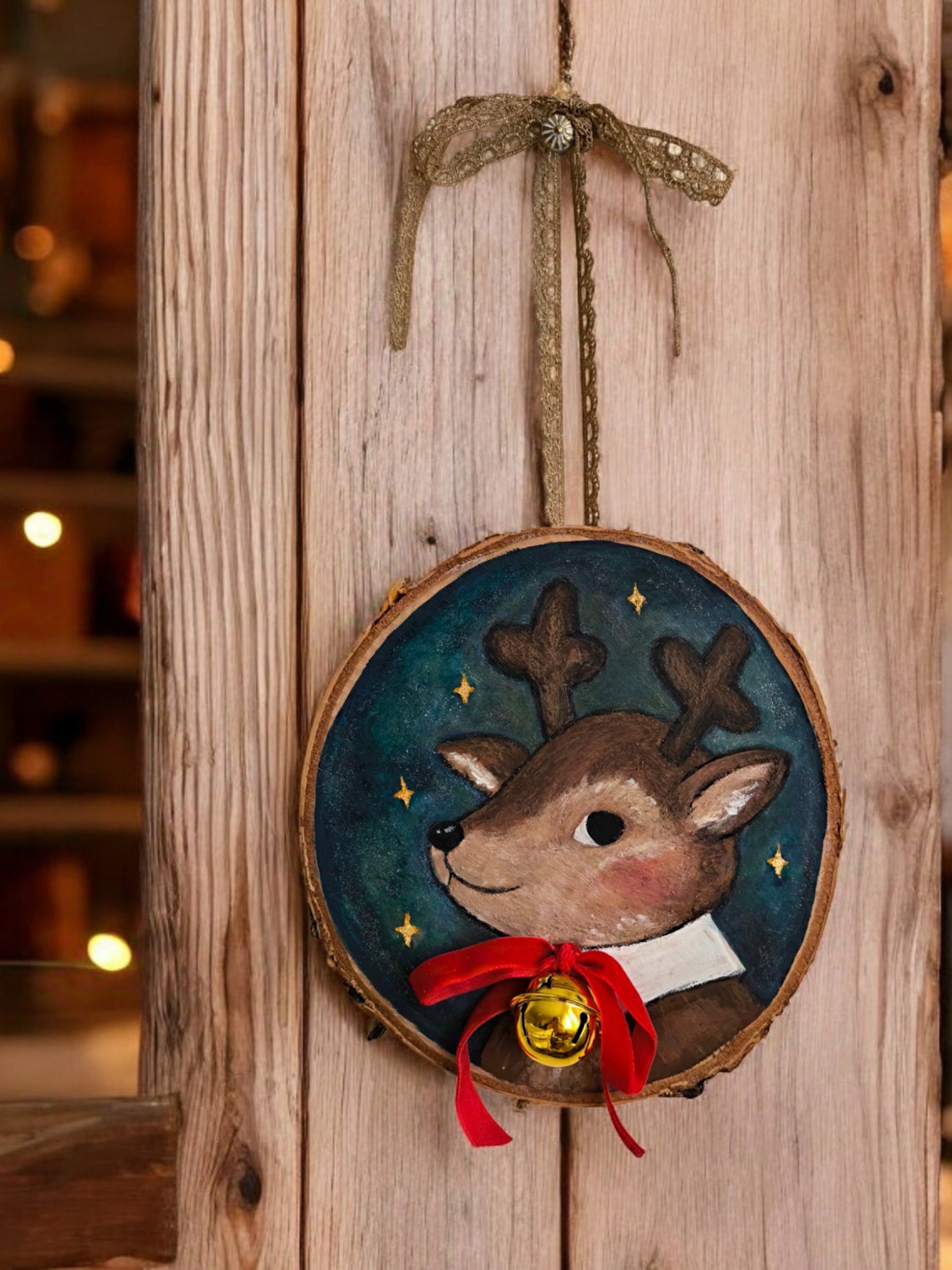 Handmade wooden wall decoration featuring a hand-painted reindeer.